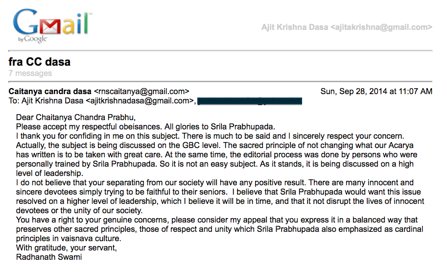 Some of our local ISKCON authorities in Denmark have tried to impress upon the Danish devotees that Caitanya Candra Dasa is violating his guru’s instructions by speaking about the book changes. But we can see this is false. Radhanath Swami says that Caitanya Candra Dasa has the right to be concerned about the book changes, and he does not prohibit Caitanya Candra Dasa from speaking publicly about the book changes – for whatever reason.