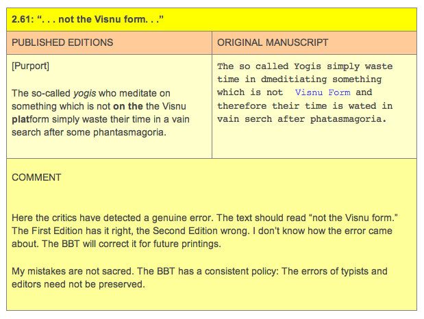 You don’t know me, but I’m a friend of a former student of yours, Bonnie McElroy [Govinda dasi]. She and I are both members of the International Society for Krishna Consciousness. The principal editor of our spiritual master’s books is here in Hawaii promoting his editorial changes, which many of our members are very unhappy with. Bonnie remembers a conversation she had with you a few years ago about bowdlerizing, and after reading Dr. Bowdler’s Legacy: a History of Expurgated Books in England and America by Noel Perrin, I realized that this is what the editors of our spiritual master’s books have been doing. Their rationalization and plea is to correct the grammar and English—supposedly to make it more acceptable to the scholarly community. They have gone farther by changing the meaning through subtle word jugglery. The reason I have written is to ask you, ‘What is the scholarly response to posthumous editing, especially of religious texts?’ Our community is meeting with the editor tomorrow; could you please write me. It would be good to know your response for further discussion.